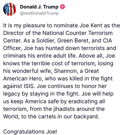 „Am plăcerea de a-l nominaliza pe Joe Kent ca director al Centrului Național de Contra-terorism. Ca soldat, (luptător în) Beretele Verzi și ofițer CIA, Joe a vânat teroriști și infractori toată viața. Mai presus, Joe știe prețul groaznic al terorismului, pierzându-și minunanta soție, Shannon, o mare eroină americană, care a fost ucisă în lupta cu ISIS.