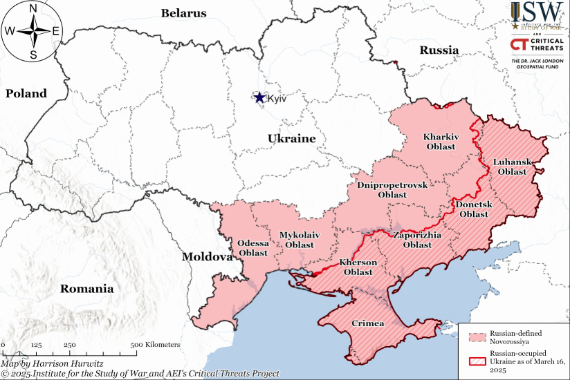 De cealaltă parte, Institutul pentru Studiul Războiului, din Statele Unite, prezintă harta de mai jos, cu așa zisa Novorusia, visată de expansioniștii moscoviți.
