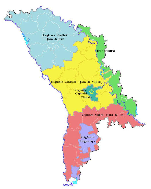 Transnistria nu e singura regiune pe care Chișinăul nu o controlează deplin, după cum se observă pe această hartă. (sursa foto) În sud, se află „Unitatea Teritorială Autonomă Găgăuzia”, cu capitala la Comrat. E un teritoriu disparat în patru zone inegale, cu o populație cam cât Baia Mare, creștin-ortodoxă vorbitoare a unei limbi înrudită cu turca. (Turcia și Rusia sunt deopotrivă influente în mica regiune.) Au un fel de parlament (Adunare Populară) și echivalentul unui președinte, numit „bașkan”.